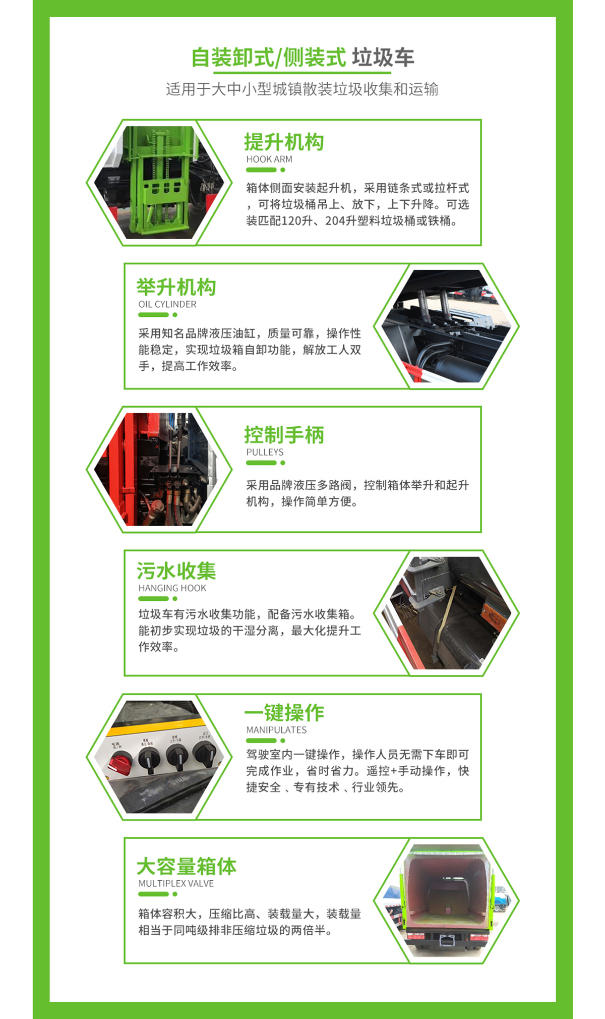 (5)提升機構:可選裝匹配120升、204升塑料垃圾桶或鐵桶。
