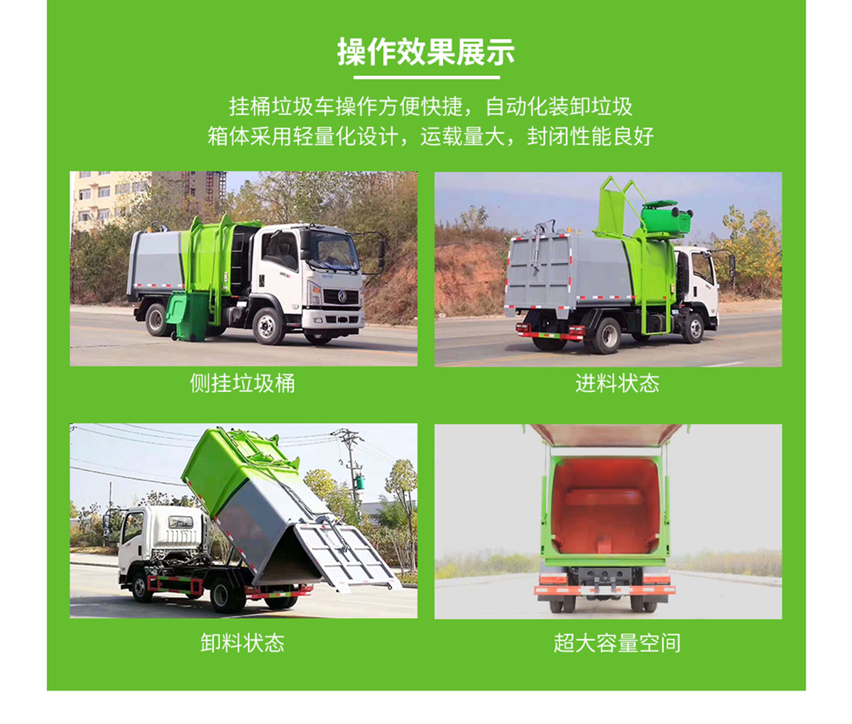 (2)壓縮比高、裝載量大:箱體容積約7立方米,裝載量相當于同噸級排非壓縮垃圾的兩倍半。