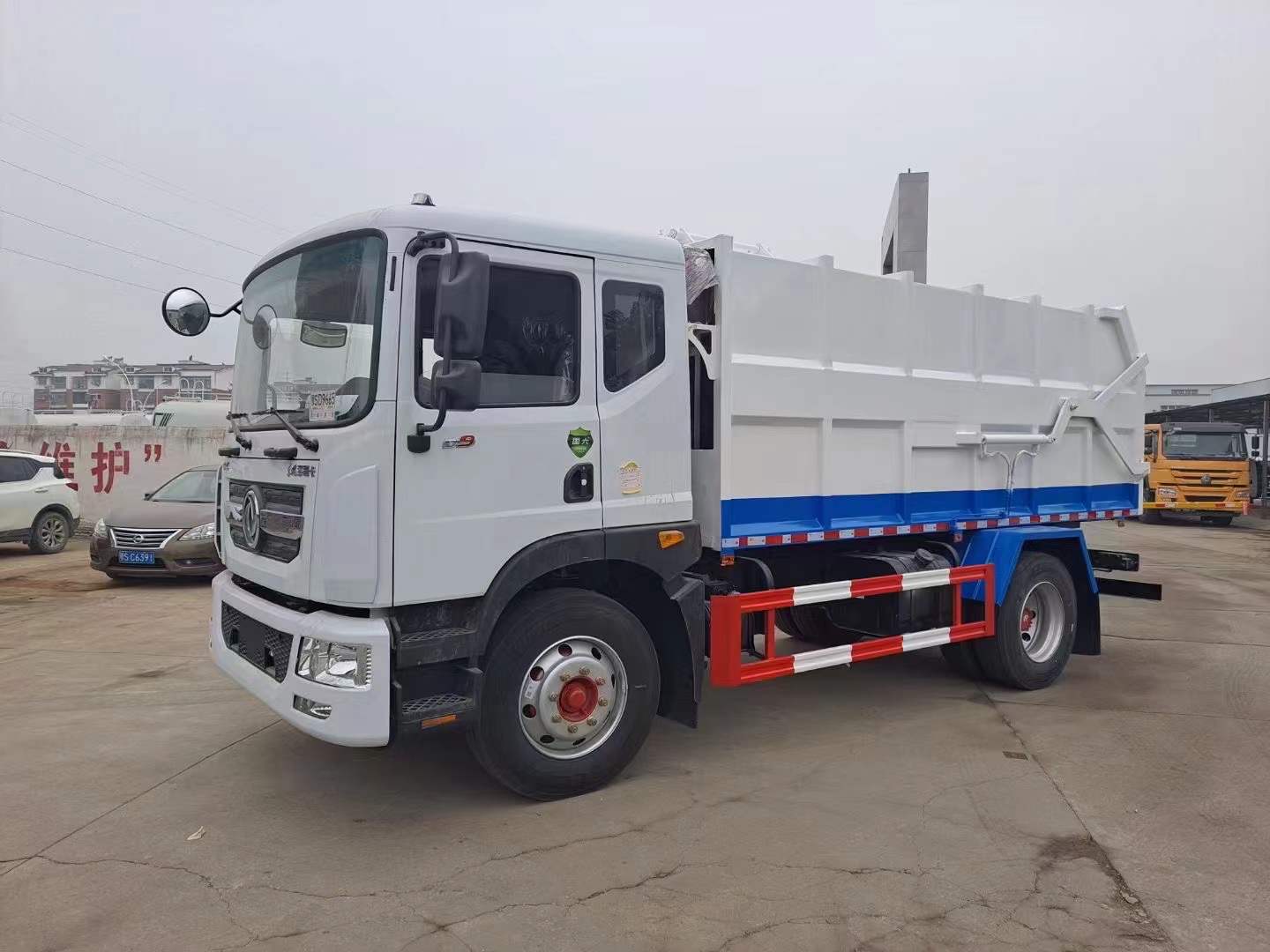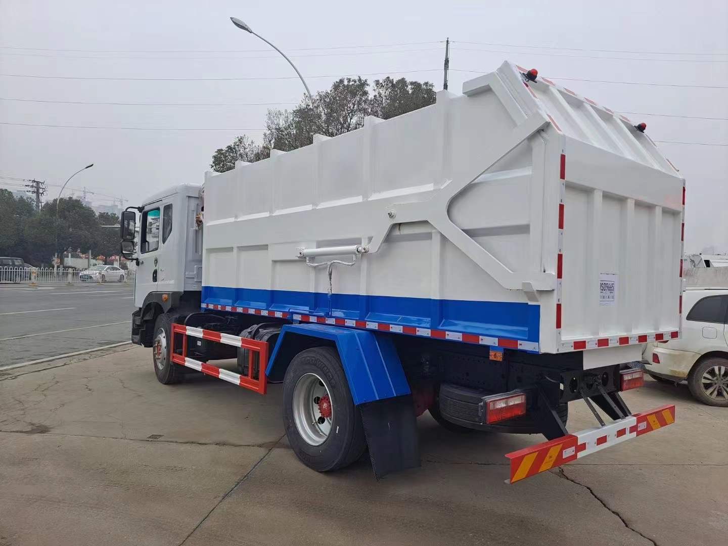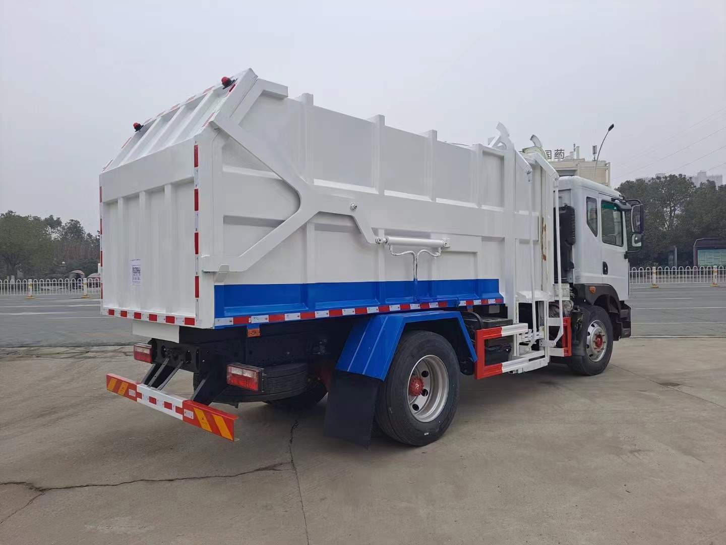 上裝配置:最大車型的掛桶圾垃車,容積大(15方),裝載量多,尾部帶剪刀式液壓開啟,更方便快捷,尾門硅膠密封條滴水不漏,拉桿式鏈條提升機可掛240L/120L標準垃圾桶。